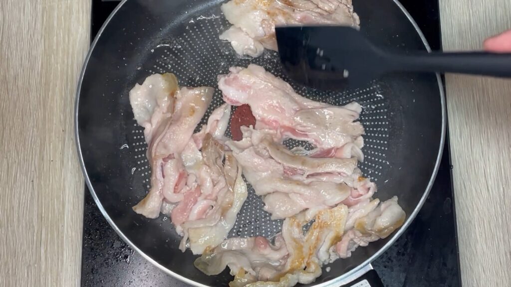 中火で豚バラ肉を広げて焼きます。