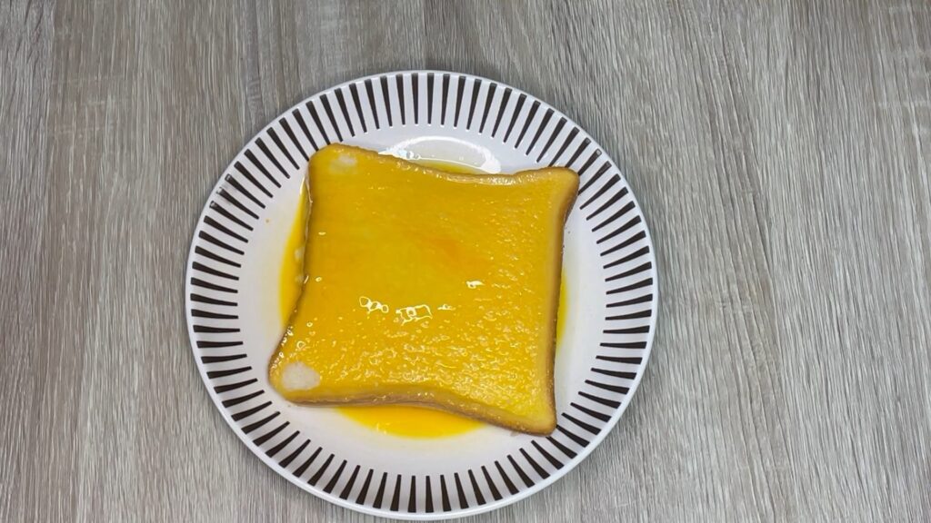 食パンを卵液に入れ、両面にしっかり染み込ませます。