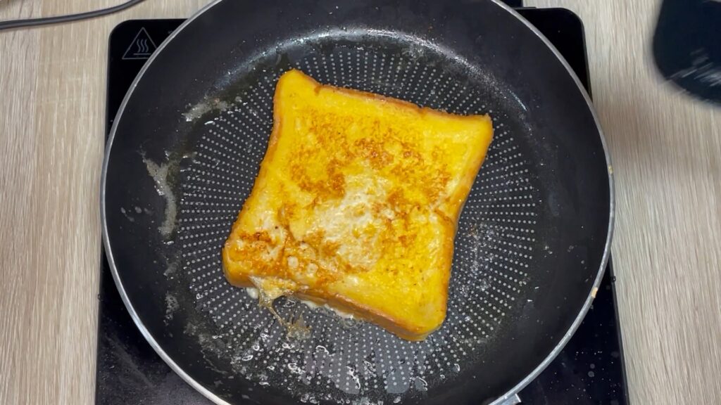 卵液を吸った食パンを中火で焼きます。