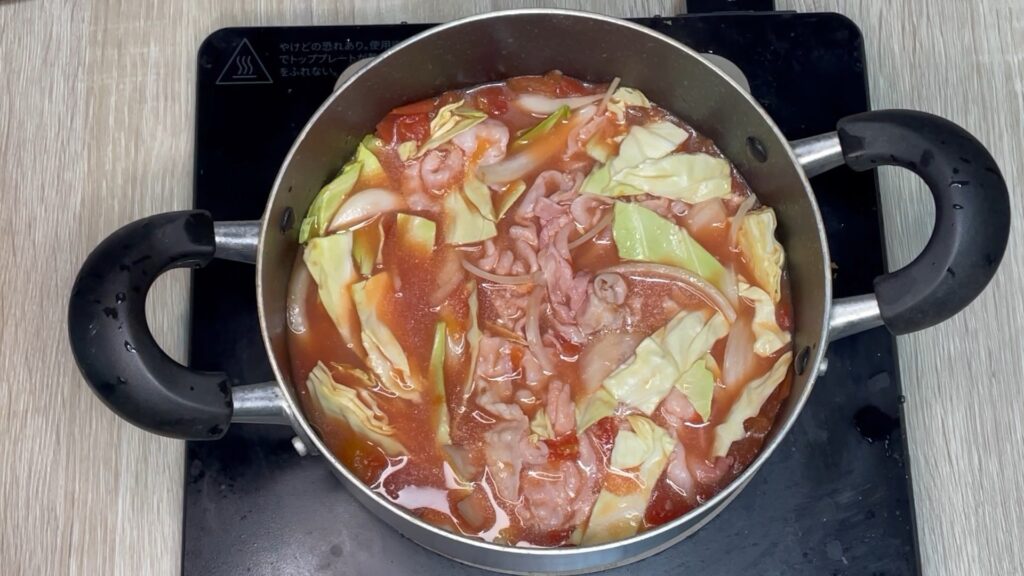 トマト缶半分で作れる米なし主食のトマト塩鍋。