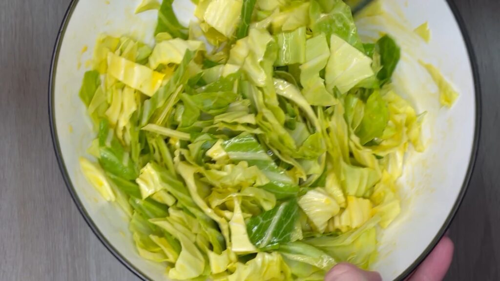 ボウルに卵を割り入れ、塩をひとつまみ加えて軽く溶きます。そこにキャベツを加え、全体をざっくり混ぜます。