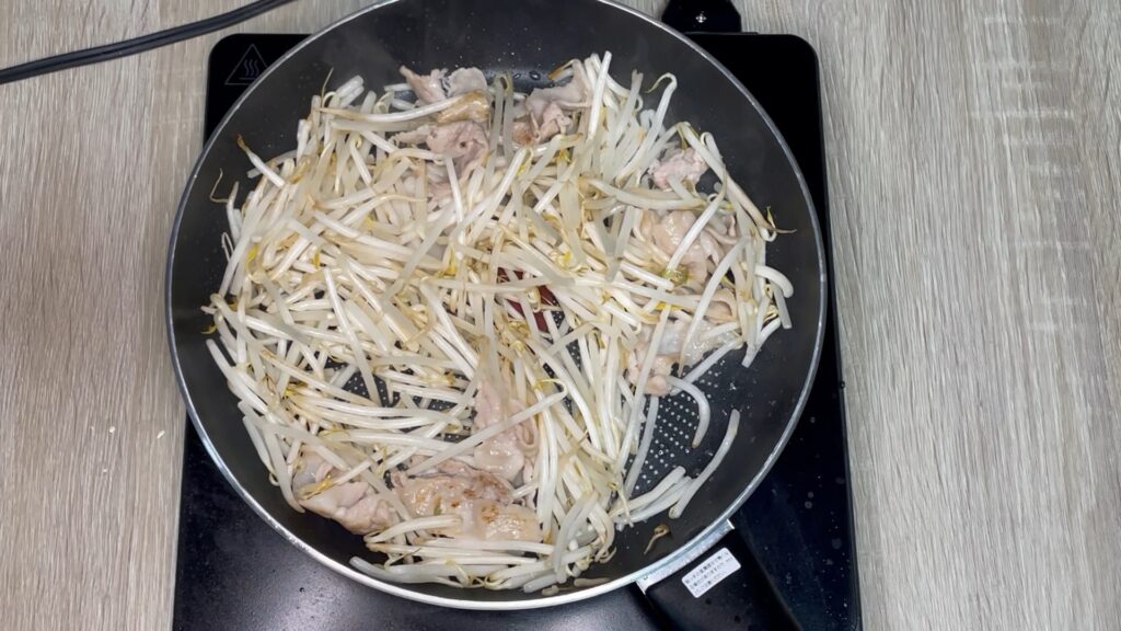 豚バラの脂がフライパンに広がったら、もやしを一気に投入します。最初は量が多く見えますが、問題ありません。