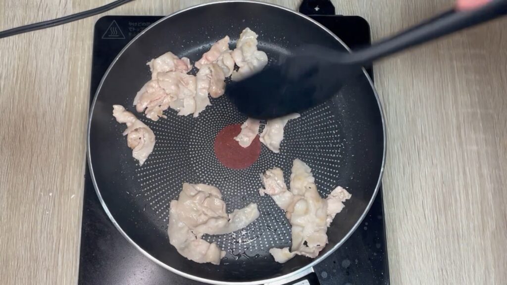 フライパンを中火で熱し、油は引かずに豚バラ肉を入れます。脂をしっかり出すように焼くのがポイント。焼き色がついたら一度火を弱めます。