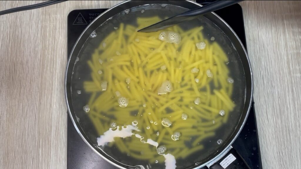 フライパンに多めの水を入れ、塩をひとつまみ加えてマカロニをゆでます。表示時間より30秒〜1分短めがベスト。
