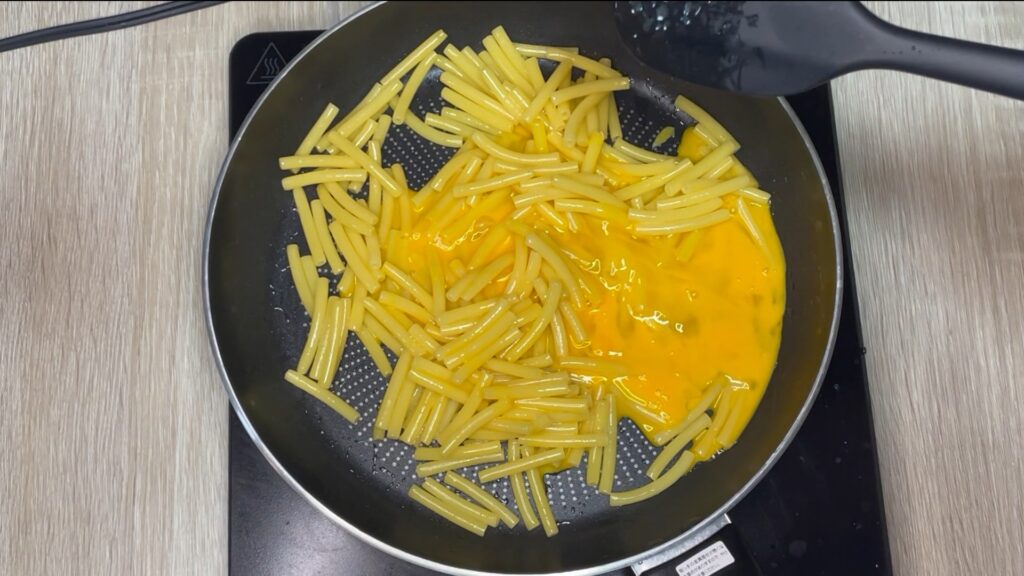 溶き卵を回し入れ、火を弱めてから全体を混ぜます。一気に火を入れず、半熟〜とろっとした状態で止めるのがコツ。