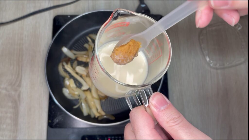 ② 味噌を少量の豆乳で溶いて、フライパンに加える