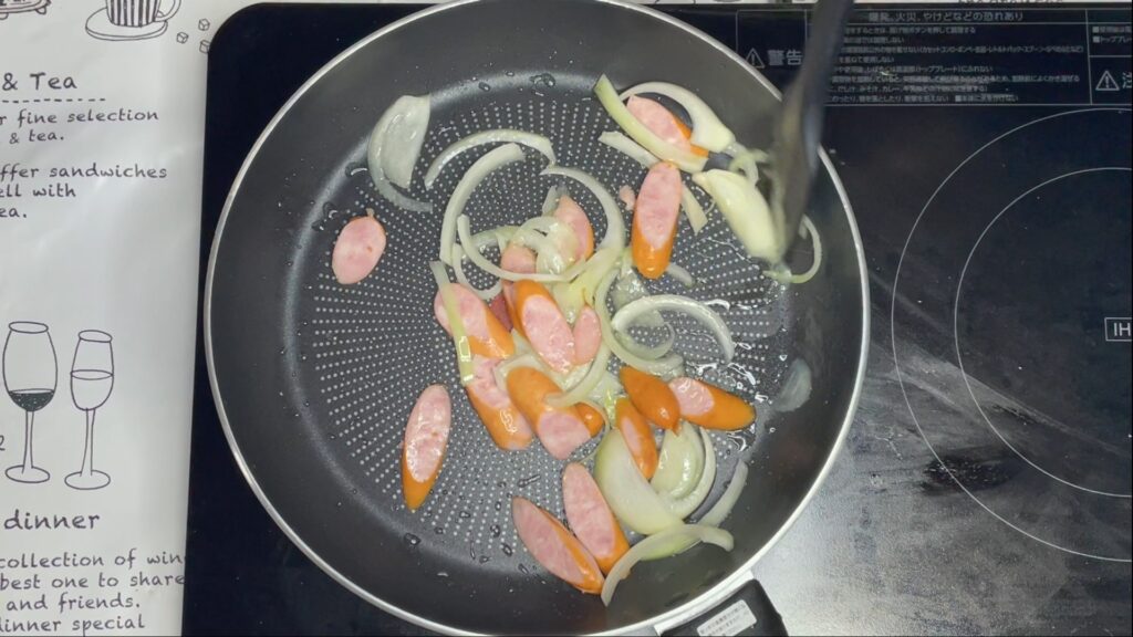 フライパンに油を入れて加熱し、玉ねぎ・ピーマン・ウインナーを炒めます。
