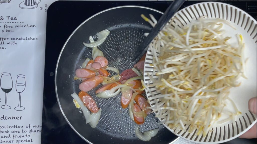 もやしを入れ、中火で3〜4分しっかり炒めます。