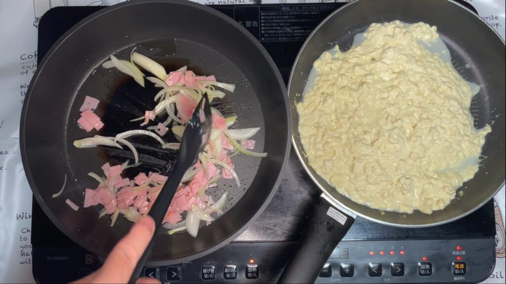 フライパンにバターを入れて熱し、玉ねぎ→→ベーコンを順番に炒めます。