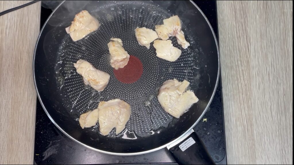 中火でむね肉の 表面だけ焼いて白くする。