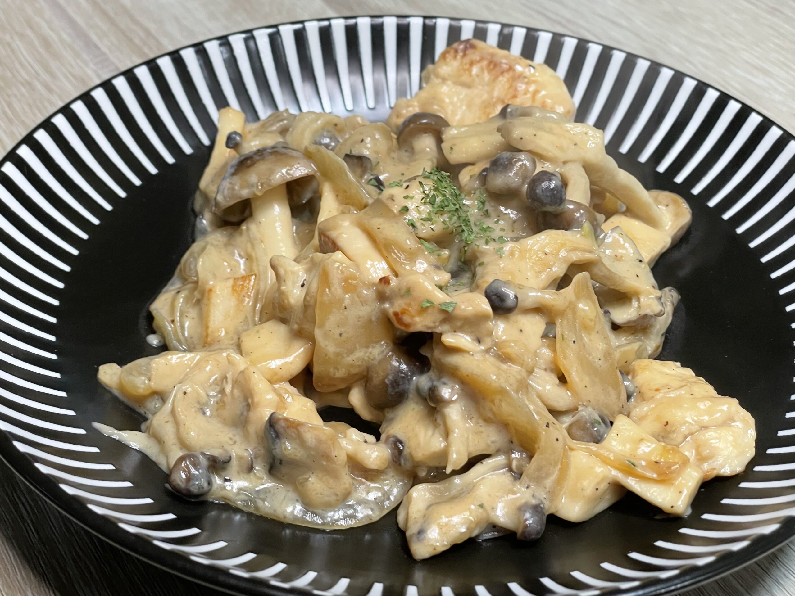 鶏むね肉 × きのこ × 豆乳で作る“軽クリーム煮”。