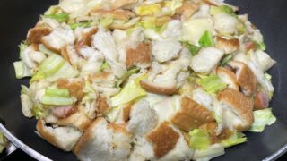卵なしでも主食になるキャベツ×パン×チーズの焼き固めレシピ。フライパンひとつで作れて、米がない日や余り食材の消費に便利な一皿。