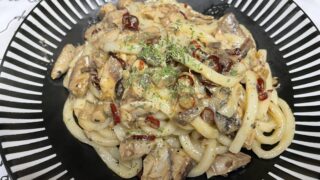 🍝【鍋あり】うどんで作るサバ缶ペペロンチーノ風炒め